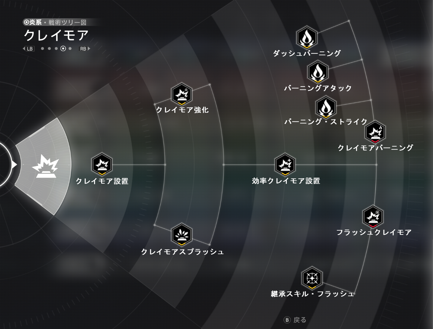 | 二重 | クレイモアバーニング | | - | クレイモアが爆発すると炎が残留し、敵に毎秒210ダメージを与えるバーニング状態を付与する。 |