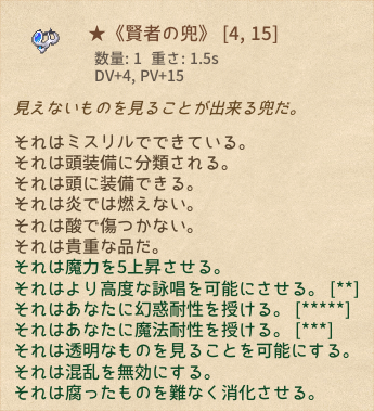 | 眩しい兜 | ★《賢者の兜》 | 頭装備 | 43 | 1 | マウスホバーで性能表示*18 |