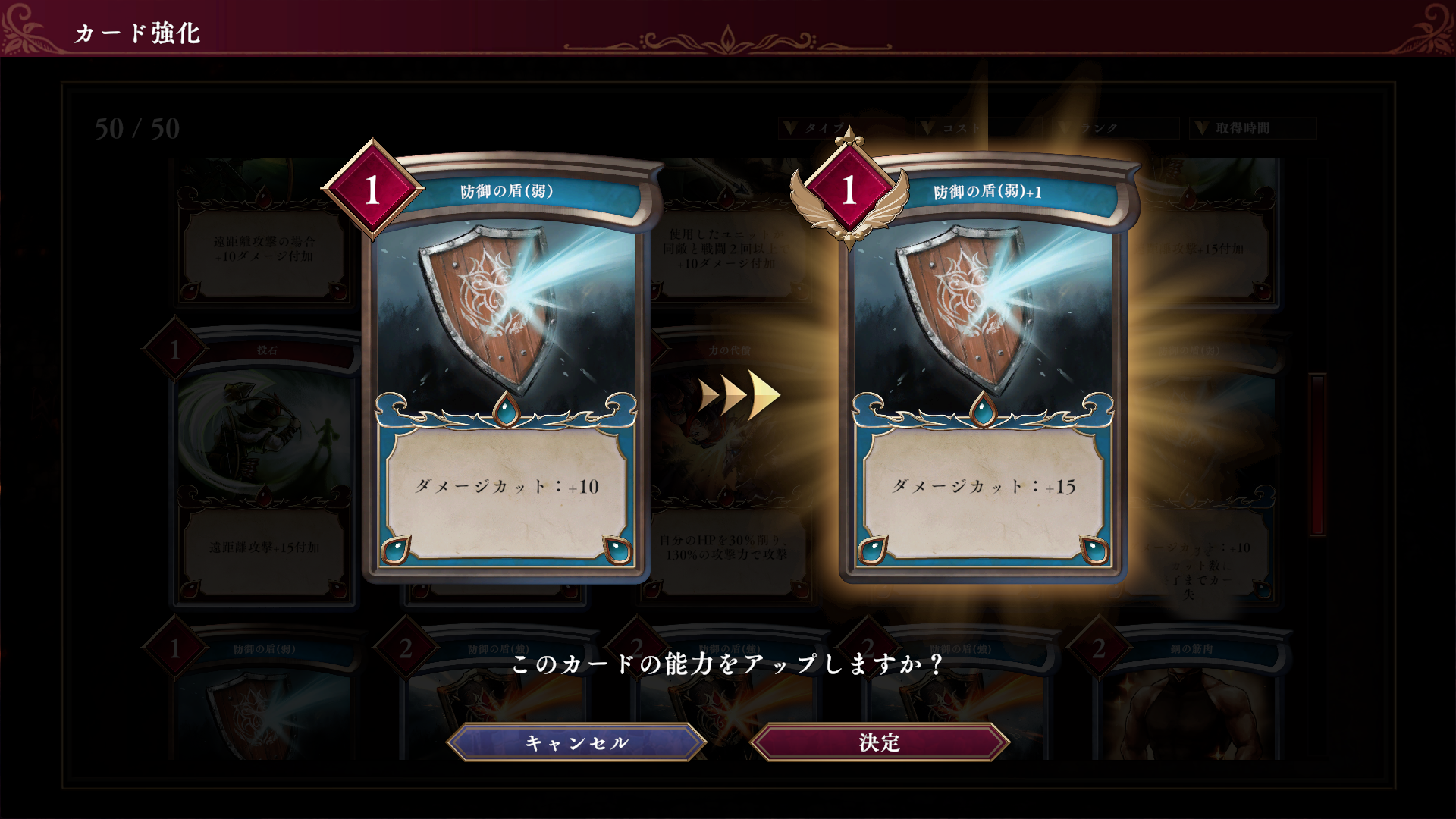 施設:カード強化を訪問すると、所持しているカードのうち、1枚を選んで強化することができる。