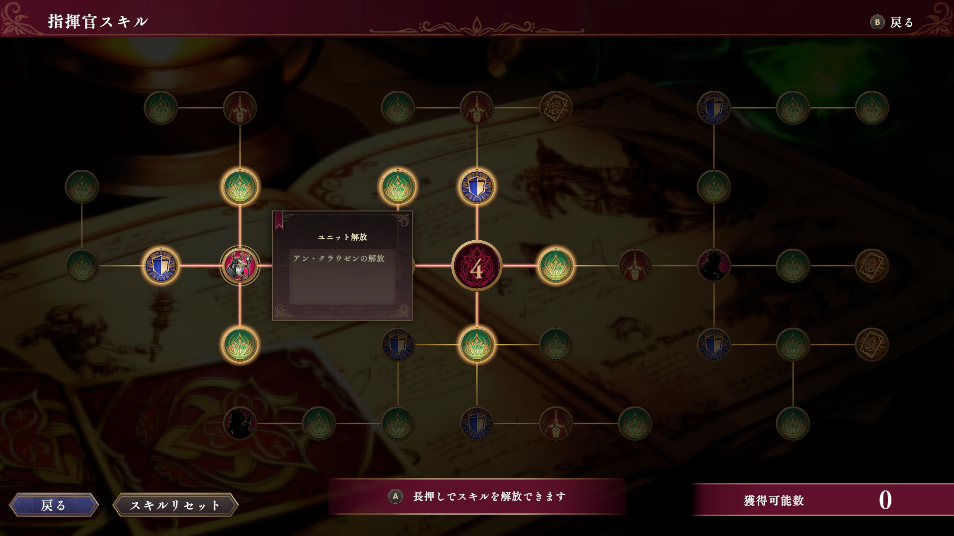指揮官レベル上昇時に得られるポイントを割り振ることで、指揮官スキルを習得できる。