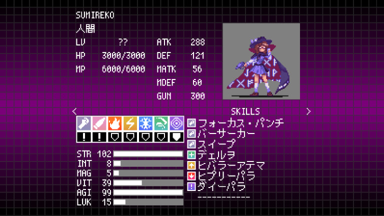 敵のSUMIREKOの属性耐性と能力値及び装備はこちらの菫子のものと同じになる。