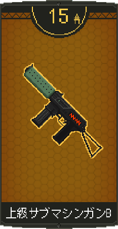 ![]() | 上級サブマシンガンBを装備。 同名武器を装備していれば耐久力が回復。 特徴:低威力高連射 |