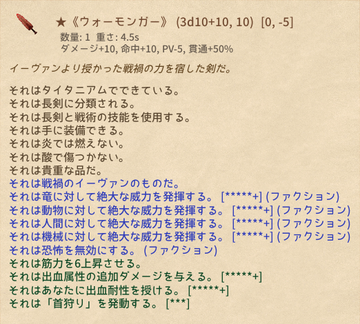 ※(ファクション)の注記がある追加効果は、そのアーティファクトをくれた神を信仰している時にしか効果を発揮しない。