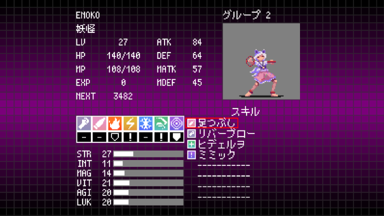 | 足つぶし | 10 | 敵単体に貫通属性の小ダメージを与える。回避力を1段階下げる |