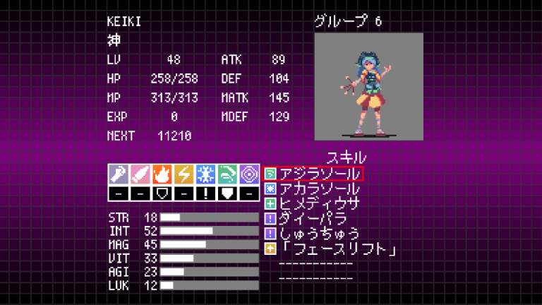 | LV | HP | MP | STR | INT | MAG | VIT | AGI | LUK | ATK | DEF | MATK | MDEF |