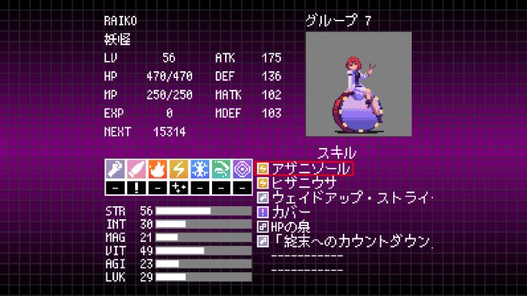 | LV | HP | MP | STR | INT | MAG | VIT | AGI | LUK | ATK | DEF | MATK | MDEF |