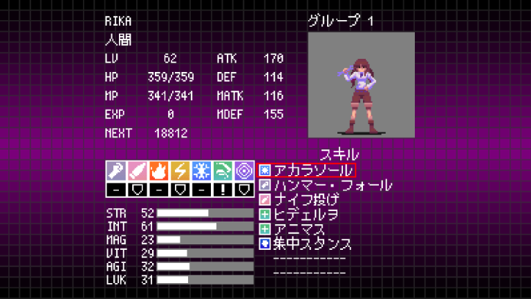 | 集中スタンス | 10 | 毎ターン使用者のMPを最大MPの5%回復し、攻撃が必ず命中するようになる。ダメージを受けた時この効果を終了し防御力が2段階下がる | RIKA |