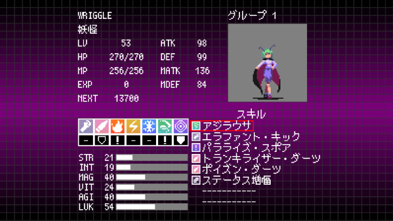 | LV | HP | MP | STR | INT | MAG | VIT | AGI | LUK | ATK | DEF | MATK | MDEF |