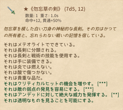 | ★《勿忘草の剣》 | 長剣 | 8 | 1 | マウスホバーで性能表示*16 |
