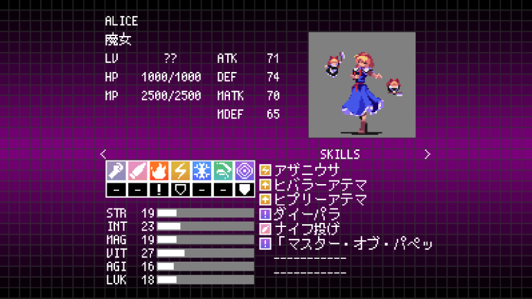| LV | HP | MP | STR | INT | MAG | VIT | AGI | LUK | ATK | DEF | MATK | MDEF |