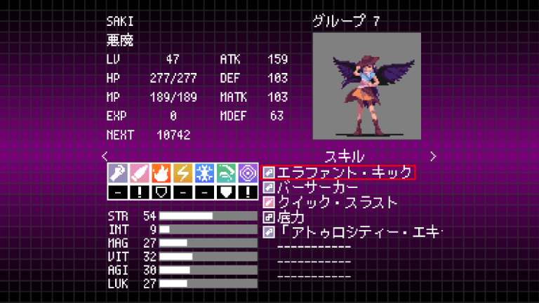 | LV | HP | MP | STR | INT | MAG | VIT | AGI | LUK | ATK | DEF | MATK | MDEF |