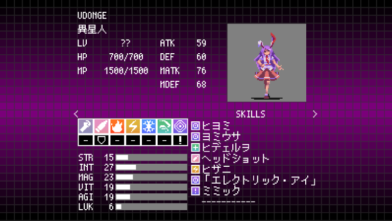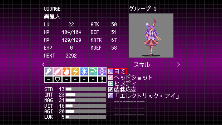 | LV | HP | MP | STR | INT | MAG | VIT | AGI | LUK | ATK | DEF | MATK | MDEF |
