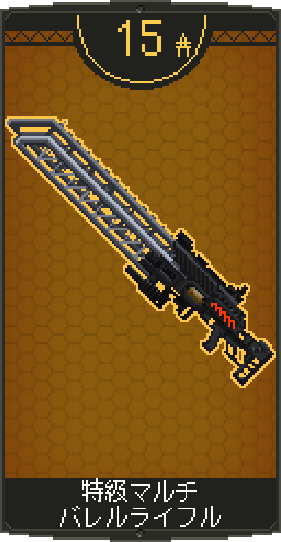 ![]() | 特級マルチバレルライフルを装備。 同名武器を装備していれば耐久力が回復。 特徴:3発同時発射 高威力高精度 ※カードのアンロックが必要 |