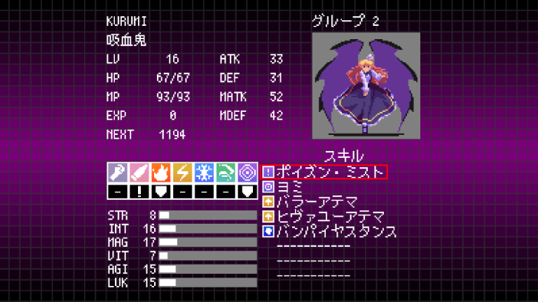 | LV | HP | MP | STR | INT | MAG | VIT | AGI | LUK | ATK | DEF | MATK | MDEF |