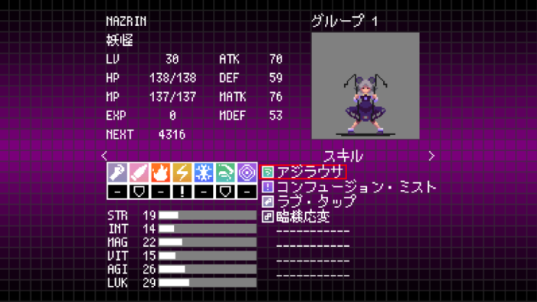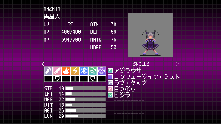 | LV | HP | MP | STR | INT | MAG | VIT | AGI | LUK | ATK | DEF | MATK | MDEF |