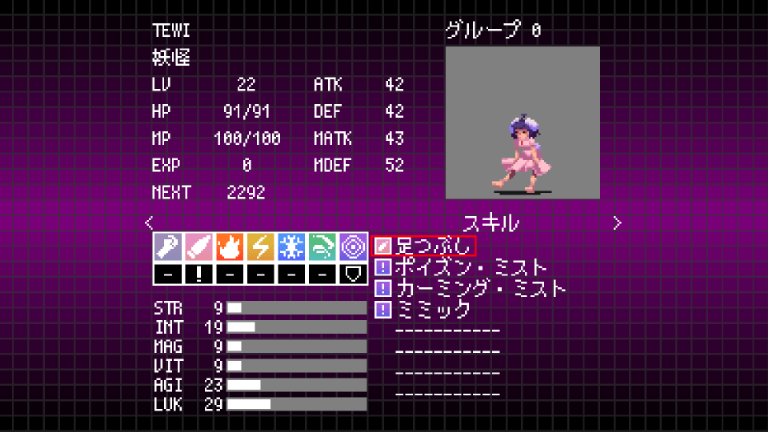 | 足つぶし | 10 | 敵単体に貫通属性の小ダメージを与える。回避力を1段階下げる |