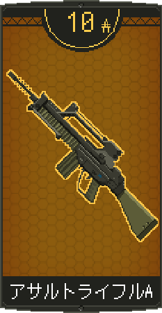 ![]() | アサルトラィフルAを装備。 同名武器を装備していれば耐久力が回復。 特徴:5点バースト |