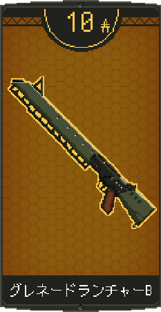 ![]() | 上級グレネードランチャーAを装備。 同名武器を装備していれば耐久力が回復。 特徴:3発散弾 爆風による範囲攻撃 |