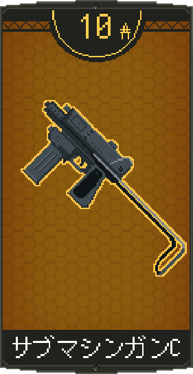 ![]() | サブマシンガンCを装備。 同名武器を装備していれば耐久力が回復。 特徴:低威力高連射 |