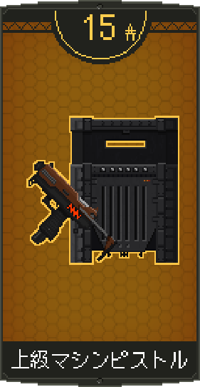 ![]() | 上級サブマシンガンAを装備。 同名武器を装備していれば耐久力が回復。 特徴:高威力低容量 |