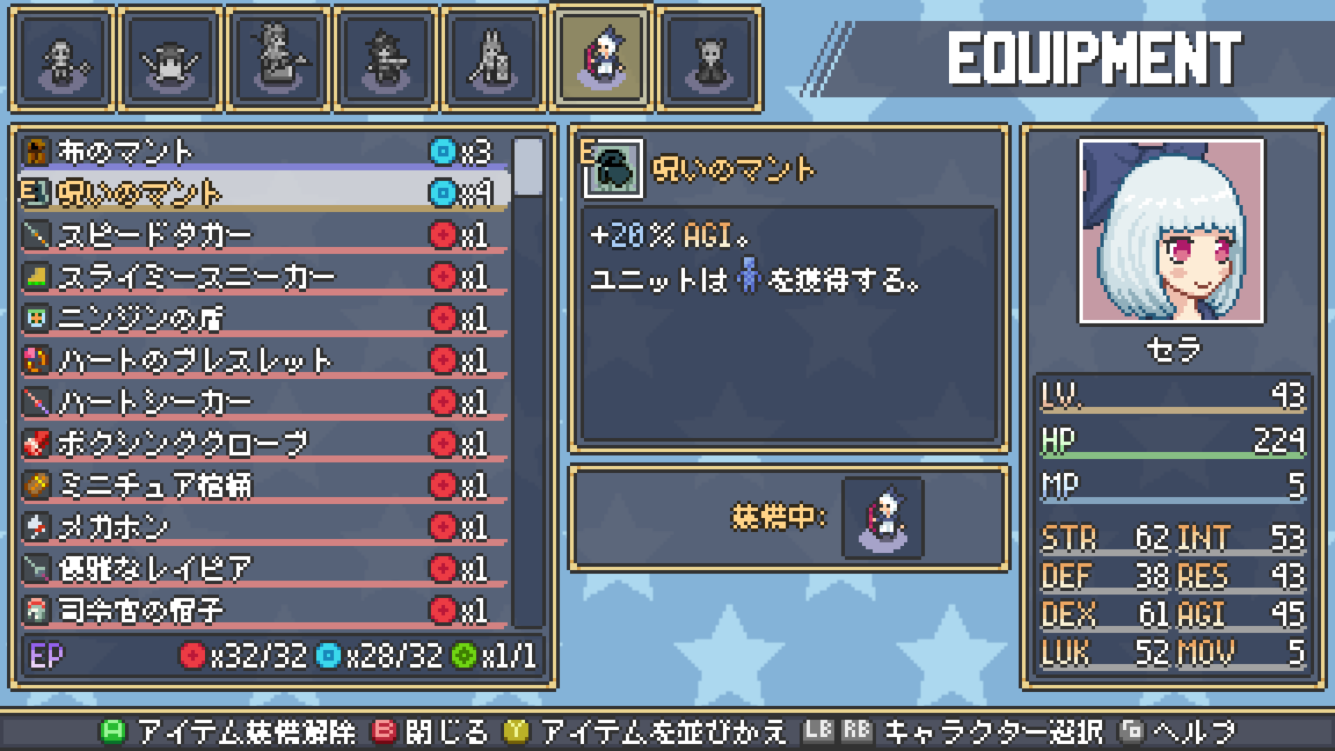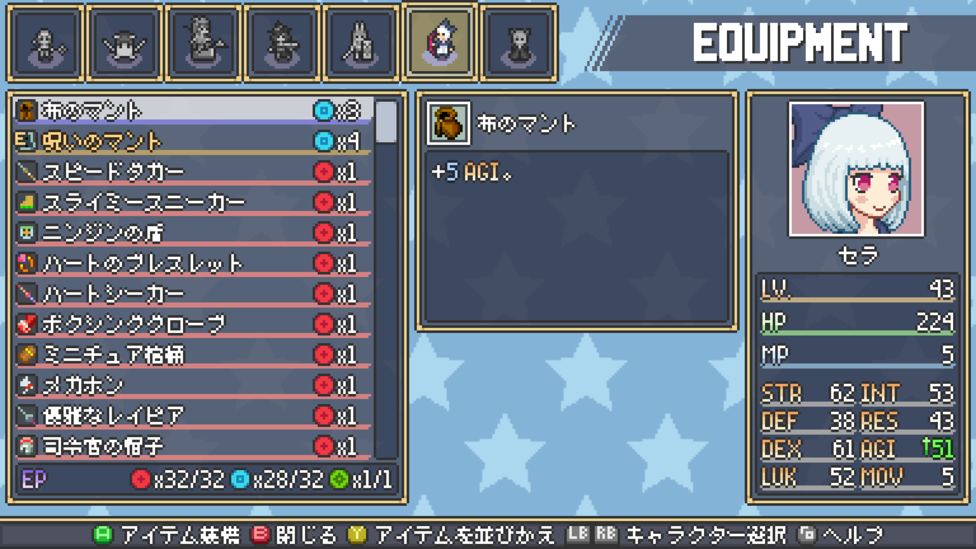 | 布のマントは本来AGI+5だが、上記画像では呪いのマントを装備しているため、 布のマントの上昇分も+20%され、AGIが+6されている。 |