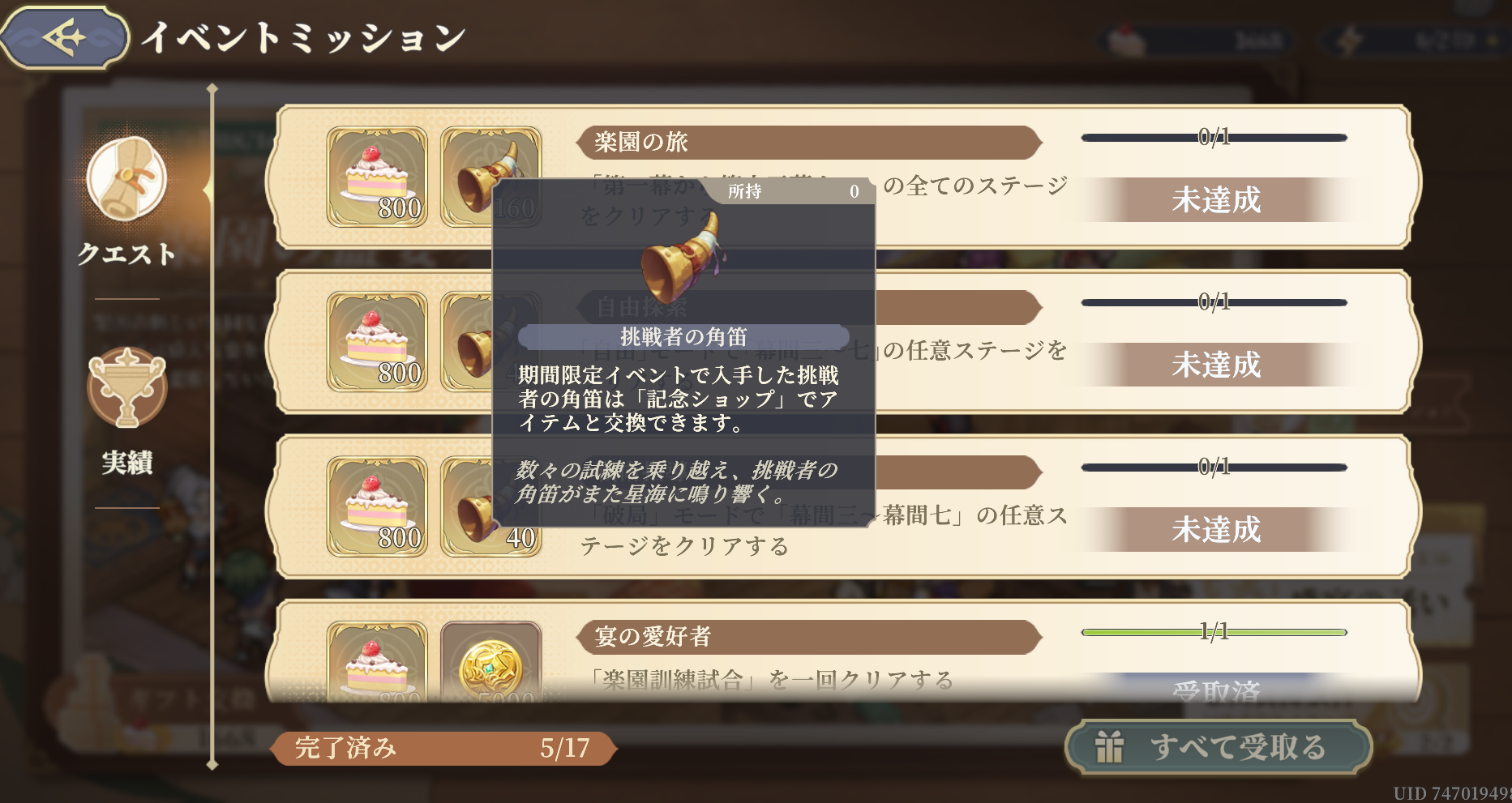 | 楽園の旅 | 「第一幕から第十三幕まで」の全てのステージをクリアする | いちごケーキ×800、挑戦者の角笛×160 |