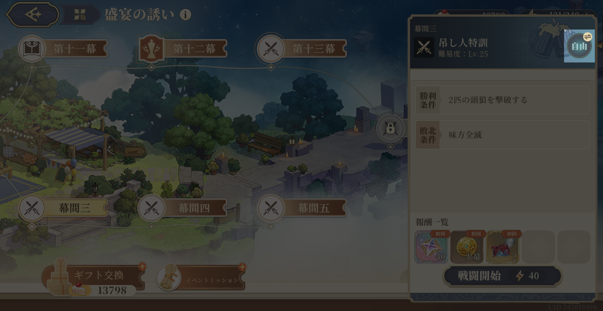 | 幕間三 | 吊し人特訓 | Lv.25 | 40 | 希望の晶石×40 楽園コイン×3000 タコの缶詰×2 |