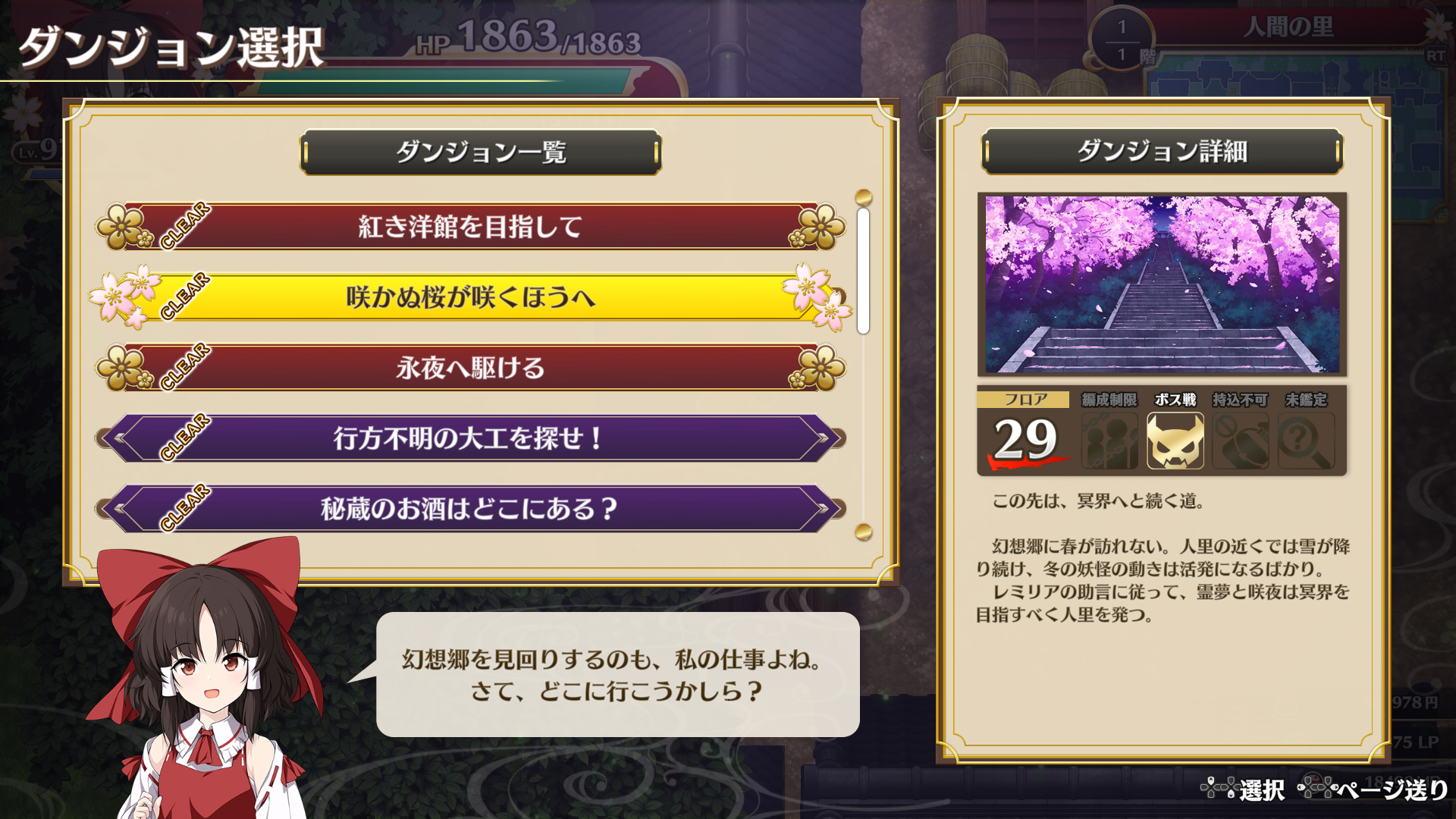 - 人間の里の出口を出ると、ダンジョン選択画面(参考画像1)が出るはずですが、そこで上下キーで「咲かぬ桜が咲くほうへ」を選択して、パートナーを選択後に表示されるキャラクター編成確認画面(参考画像2)で、咲かぬ桜が咲く方へ フロア数29 「このマップに挑戦しますか?」と表示されたことを確認してから、「はい」を選択すると、1フロア目は「山枯るる雪道」(参考画像3)というマップに出るはずです。間違いなくダンジョンを選択し、確認画面でも「咲かぬ桜が咲く方へ」に挑戦しますか?と出ているのにもかかわらず「霧の湖」に出てしまう場合、何らかのバグの可能性があるので、公式の不具合報告スレッド(https://steamcommunity.com/app/1847150/discussions/0/4354495576375185880/)に報告願います。 -- 管理人