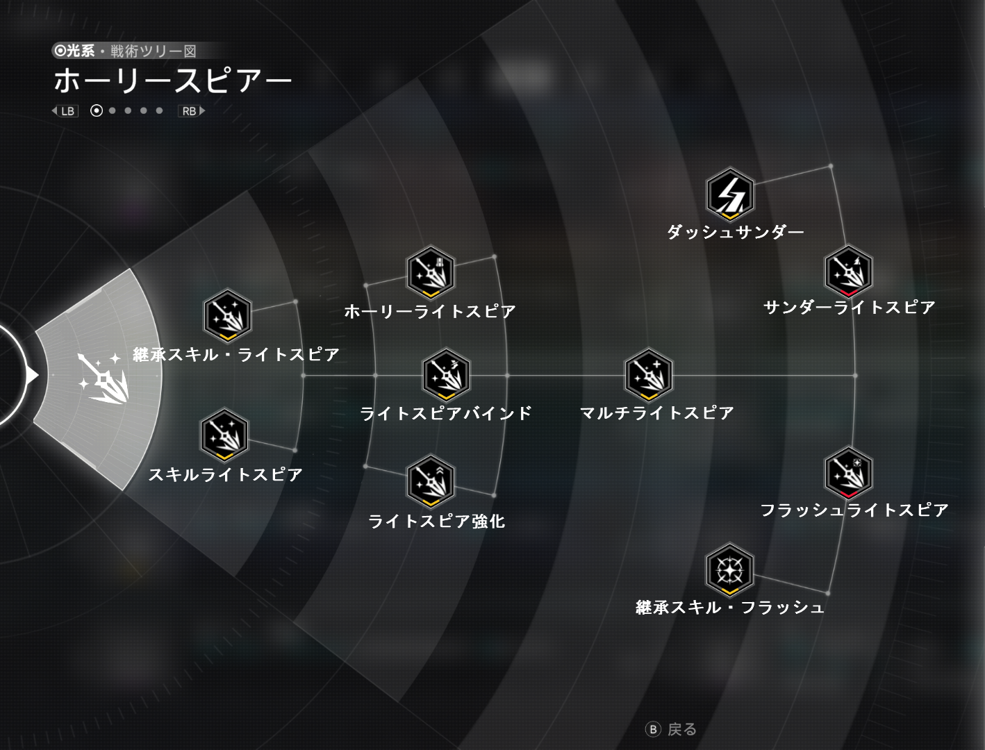 | Ⅲ | マルチライトスピア | - | ホワイト | ライトスピアの数が2本増え、ダメージが44%上昇する。 |
