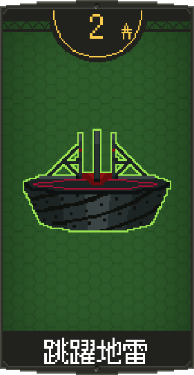 跳躍地雷.png設置地上の敵が踏むと作動し、跳躍して下方を散弾で攻撃する地雷をその場に設置する。三回作動すると壊れる