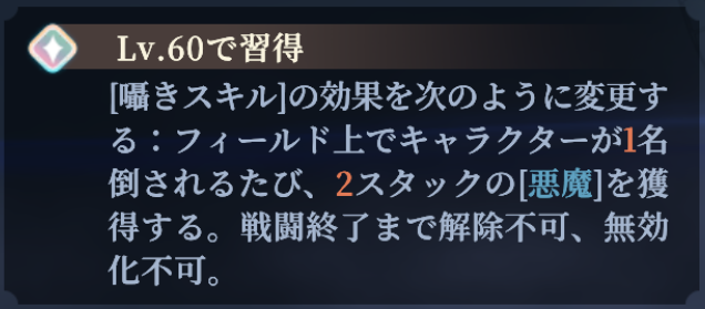 | 悪魔の誘惑 | フィールド上でキャラクターが1名倒されるたび、1スタックの[悪魔]*2を獲得する。解除・無効化不可。戦闘終了まで継続する |