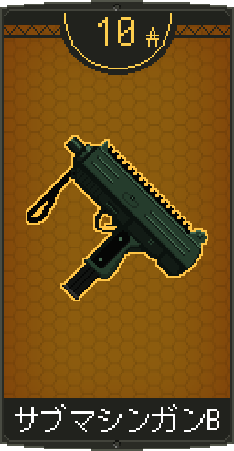 ![]() | 上級サブマシンガンBを装備。 同名武器を装備していれば耐久力が回復。 特徴:低威力高連射 |