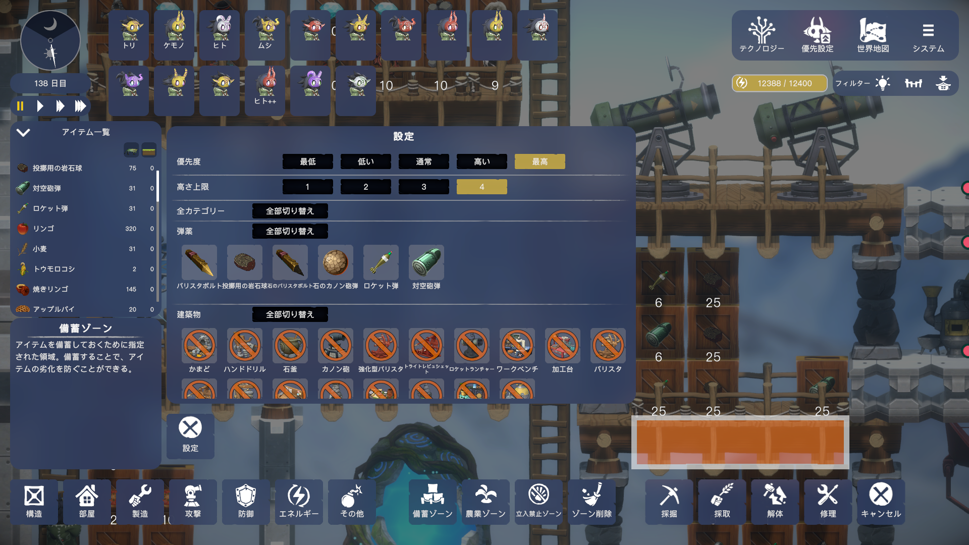 備蓄ゾーンを選択すると、備蓄の優先度・そのゾーンに置かないアイテム・何段まで重ねておくかを設定できる。