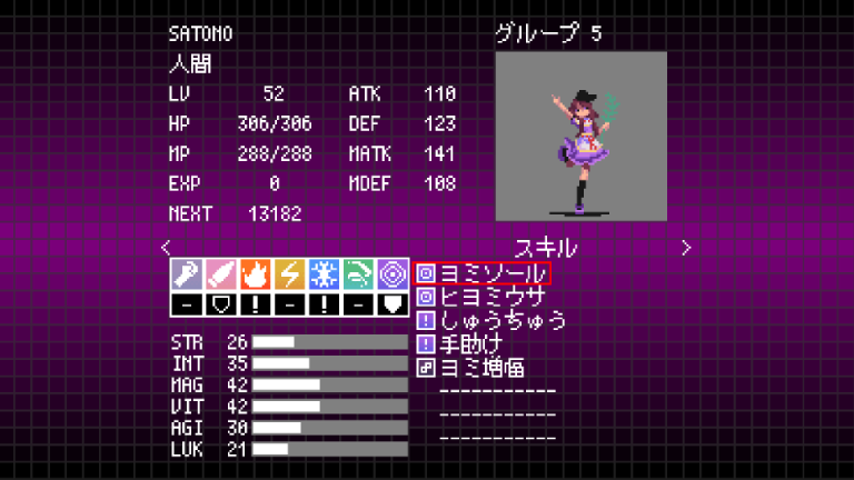 | LV | HP | MP | STR | INT | MAG | VIT | AGI | LUK | ATK | DEF | MATK | MDEF |