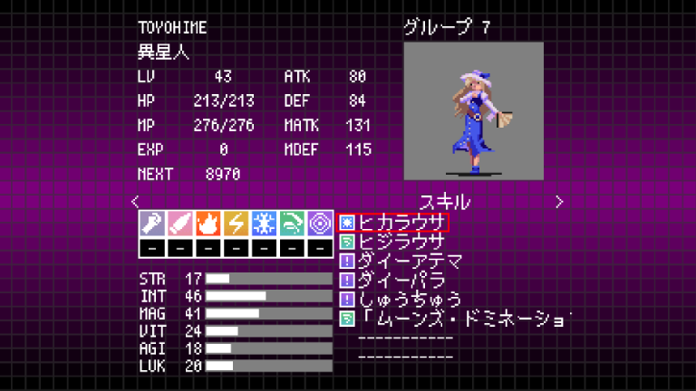 | LV | HP | MP | STR | INT | MAG | VIT | AGI | LUK | ATK | DEF | MATK | MDEF |