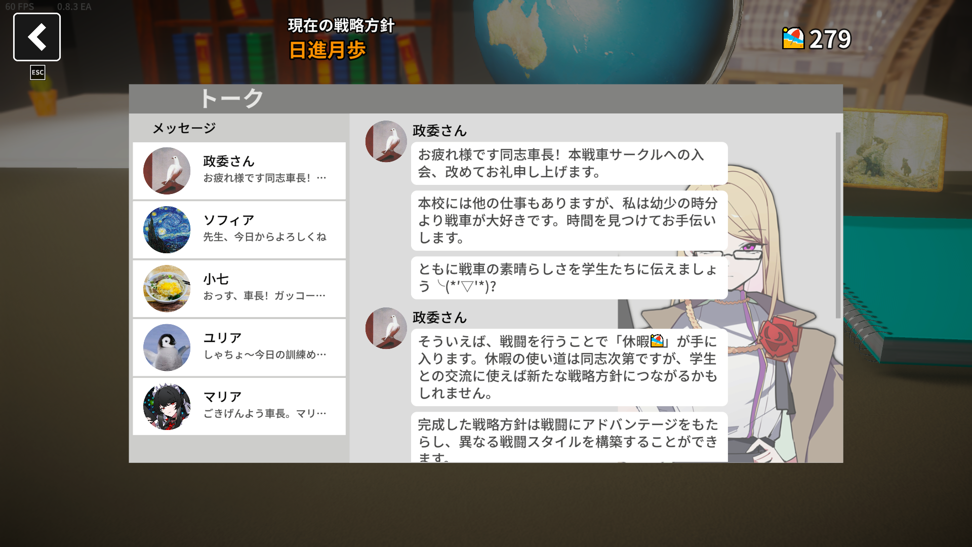 部室画面の左上のアイコンから、戦車サークルの生徒たちとコミュニケーションをとることができる。
