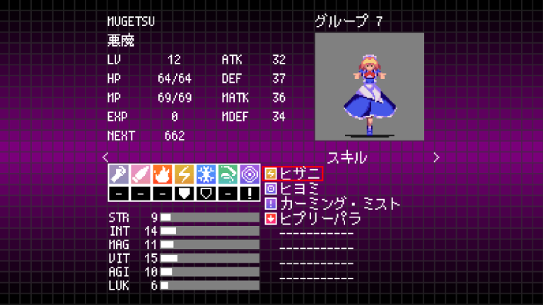 | LV | HP | MP | STR | INT | MAG | VIT | AGI | LUK | ATK | DEF | MATK | MDEF |