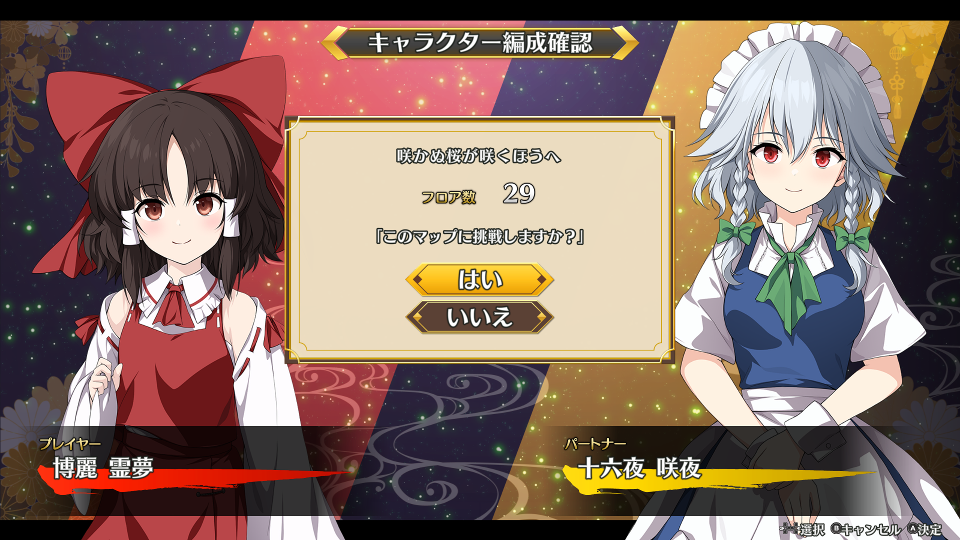 - 人間の里の出口を出ると、ダンジョン選択画面(参考画像1)が出るはずですが、そこで上下キーで「咲かぬ桜が咲くほうへ」を選択して、パートナーを選択後に表示されるキャラクター編成確認画面(参考画像2)で、咲かぬ桜が咲く方へ フロア数29 「このマップに挑戦しますか?」と表示されたことを確認してから、「はい」を選択すると、1フロア目は「山枯るる雪道」(参考画像3)というマップに出るはずです。間違いなくダンジョンを選択し、確認画面でも「咲かぬ桜が咲く方へ」に挑戦しますか?と出ているのにもかかわらず「霧の湖」に出てしまう場合、何らかのバグの可能性があるので、公式の不具合報告スレッド(https://steamcommunity.com/app/1847150/discussions/0/4354495576375185880/)に報告願います。 -- 管理人