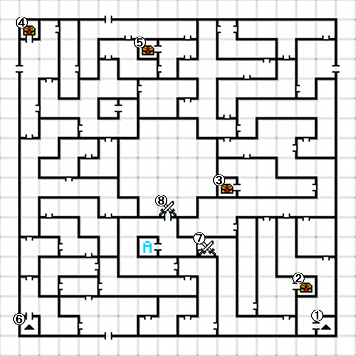 A,B,Cの落とし穴は宝箱のある小部屋に通じている。Dの落とし穴に落ちると、先に進む道に落ちることができる。