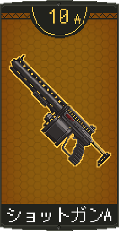 ![]() | ショットガンAを装備。 同名武器を装備していれば耐久力が回復。 特徴:7発散弾 低威力大容量 |